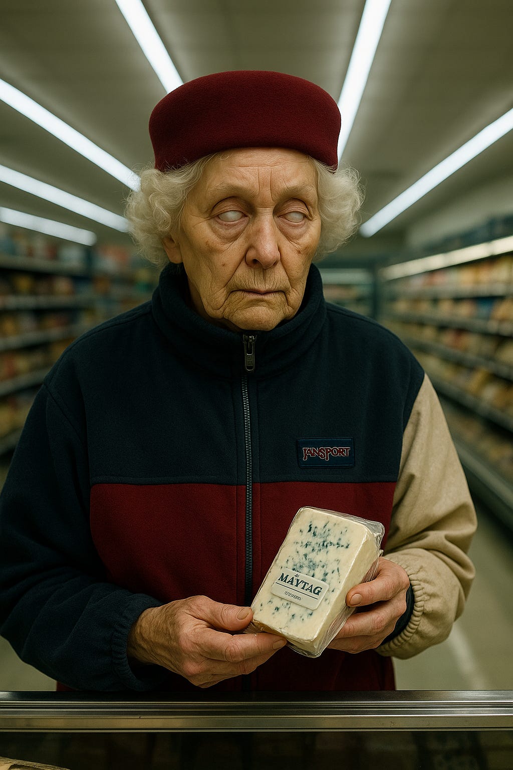 She was holding a brick of Maytag blue cheese, peeled open, staring at the crumbling cottage white flesh of the thing like an oracle - or, she would have been, were her eyes not almost completely whited out from cataracts. It almost looked like she was sniffing for it - like something that had emerged sightless from the earth, old and young, ageless and ancient.