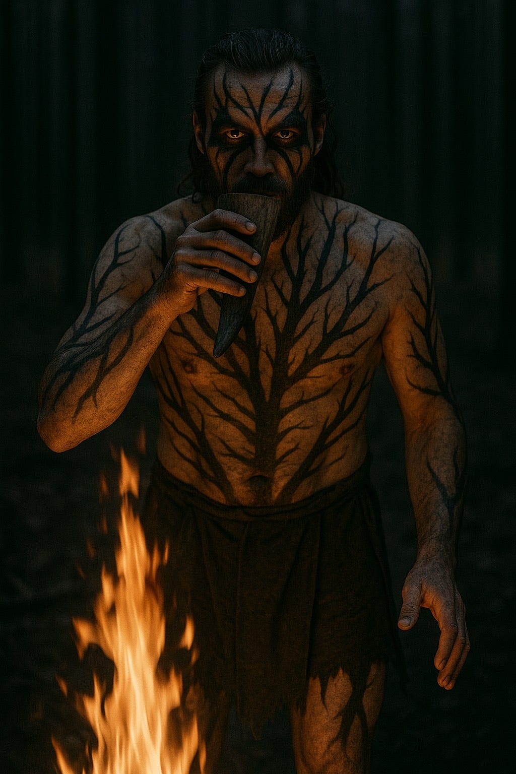 Once, in a dream, I found myself in the forest listening to a strange man tell me a story. He walked around a fire, drinking from a cup carved from a horn; covered in streaks of midnight mimicking tree branches that curved up his body, and across his eyes. As he came closer and retreated from the fire, stumbling as he told his tale, he looked like he was welcomed by the forest.